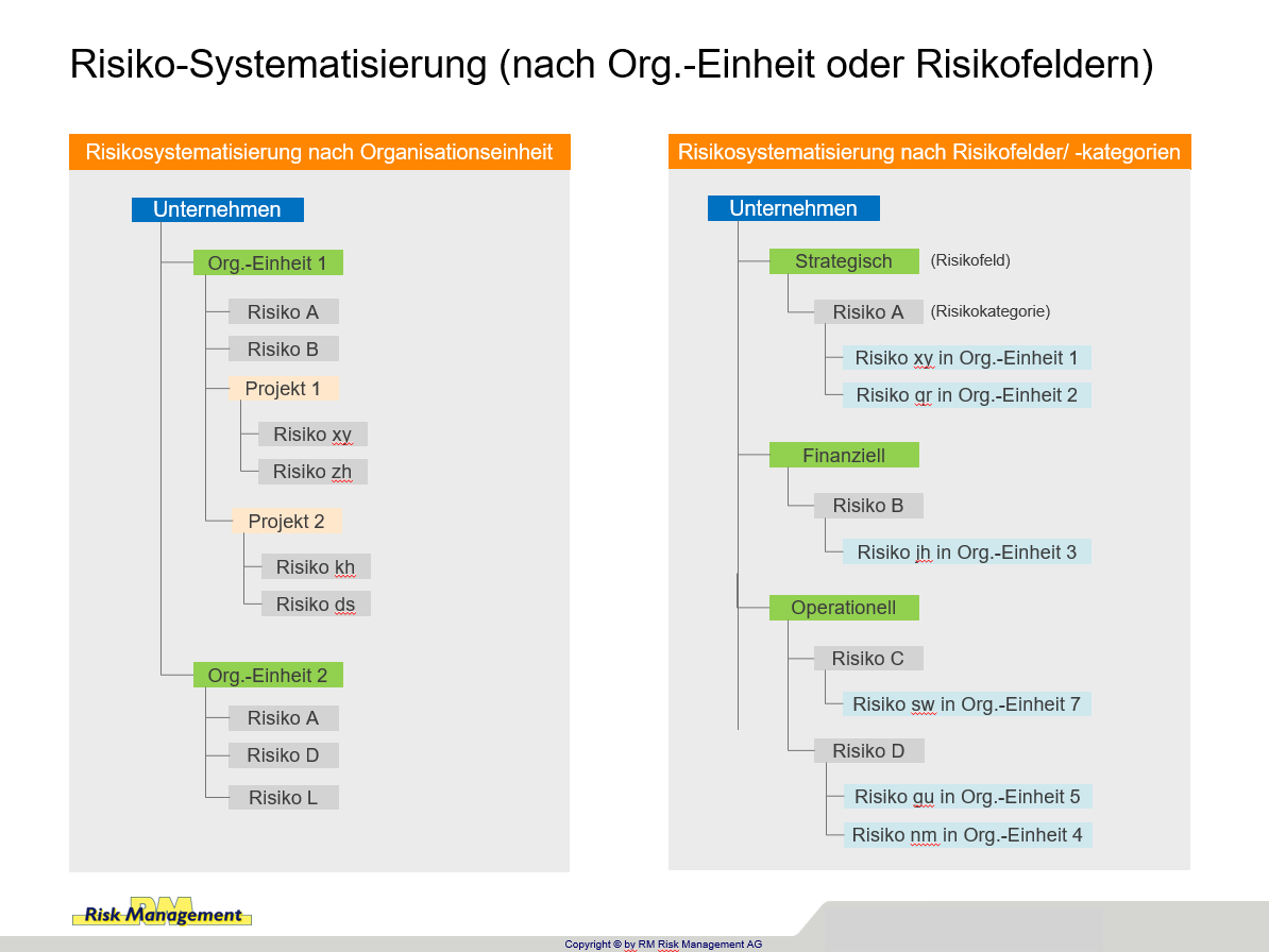Statt Einzelrisiken isoliert zu betrachten, werden diese in Kategorien (Risikofelder) zusammengefasst – das erleichtert die Übersicht, Priorisierung und strategische Steuerung.